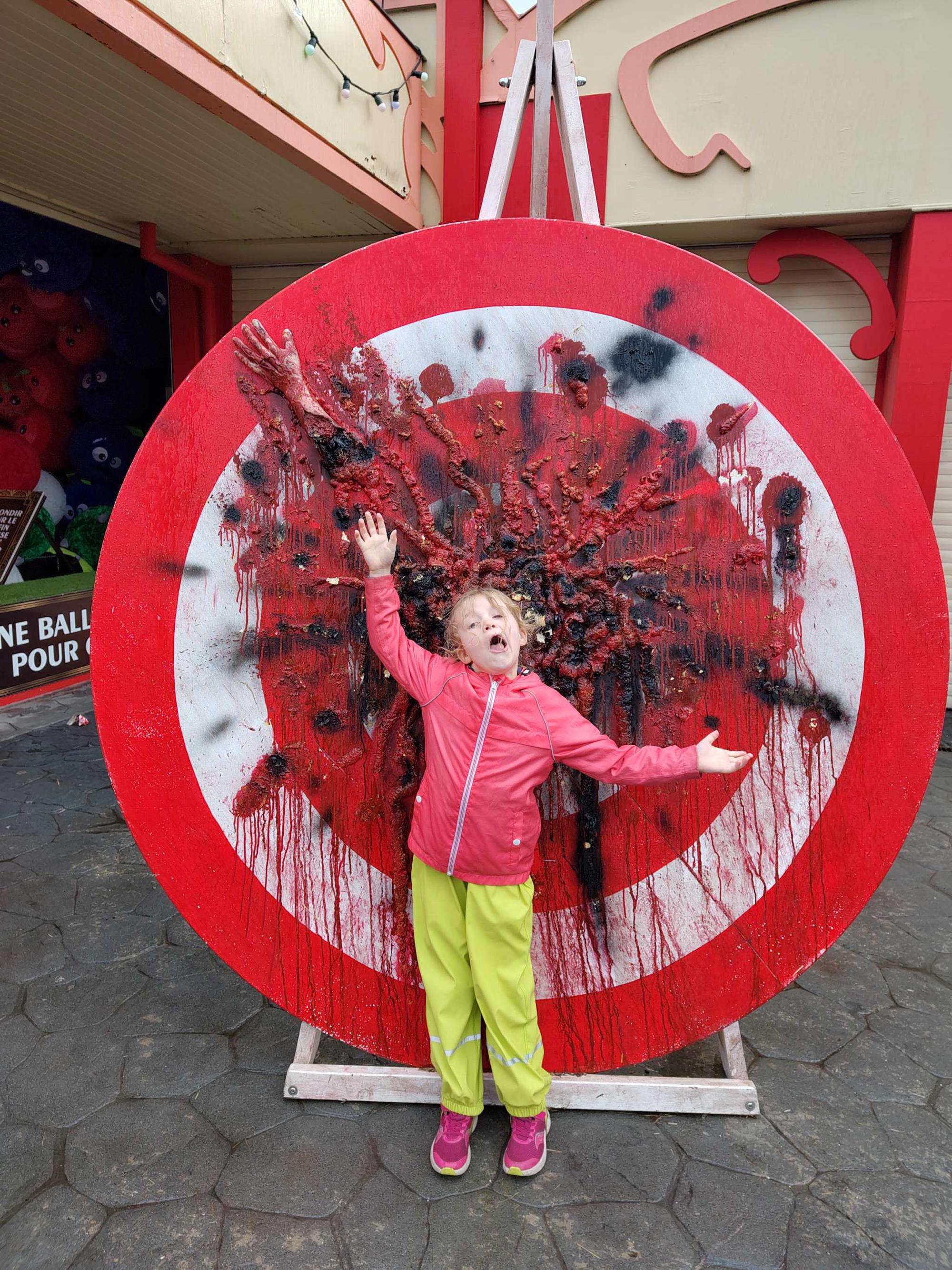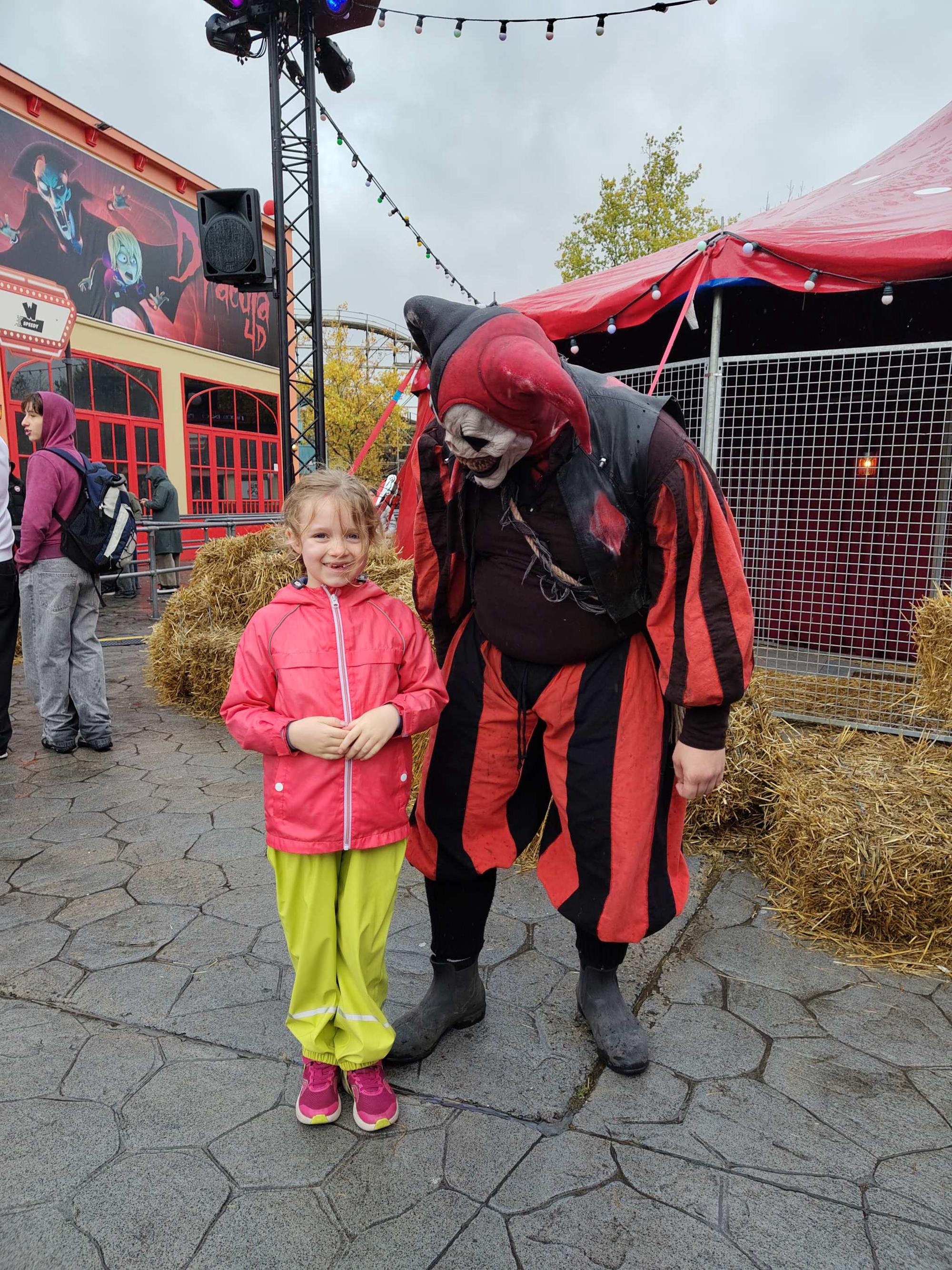 I can't say any ride lasting just 2 minutes is worth that long a wait but we all agreed it was great fun. Next up there was no queue for Dracula 4D and it gave us 5 mins to sit down inside and warm up at least. To get to the next section of rides we had to go through the first of the scare zones. This one was called freaky circus and I have to say the costumes were rather terrifying. We're not talking kid friendly, but full on psycho clowns with mangled body parts in their hands and covered in blood. Liliya of course being our honey badger child lapped it up and wanted her photo with one of them.
