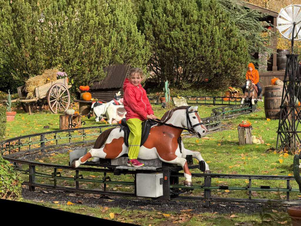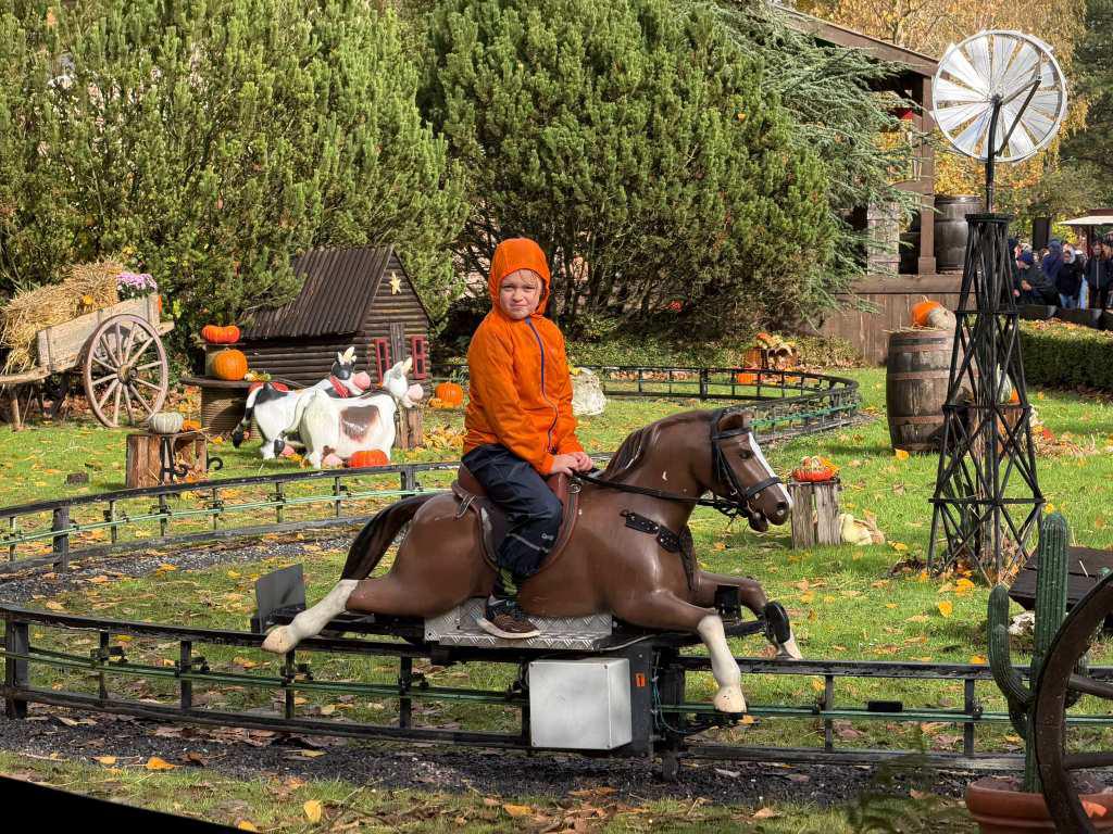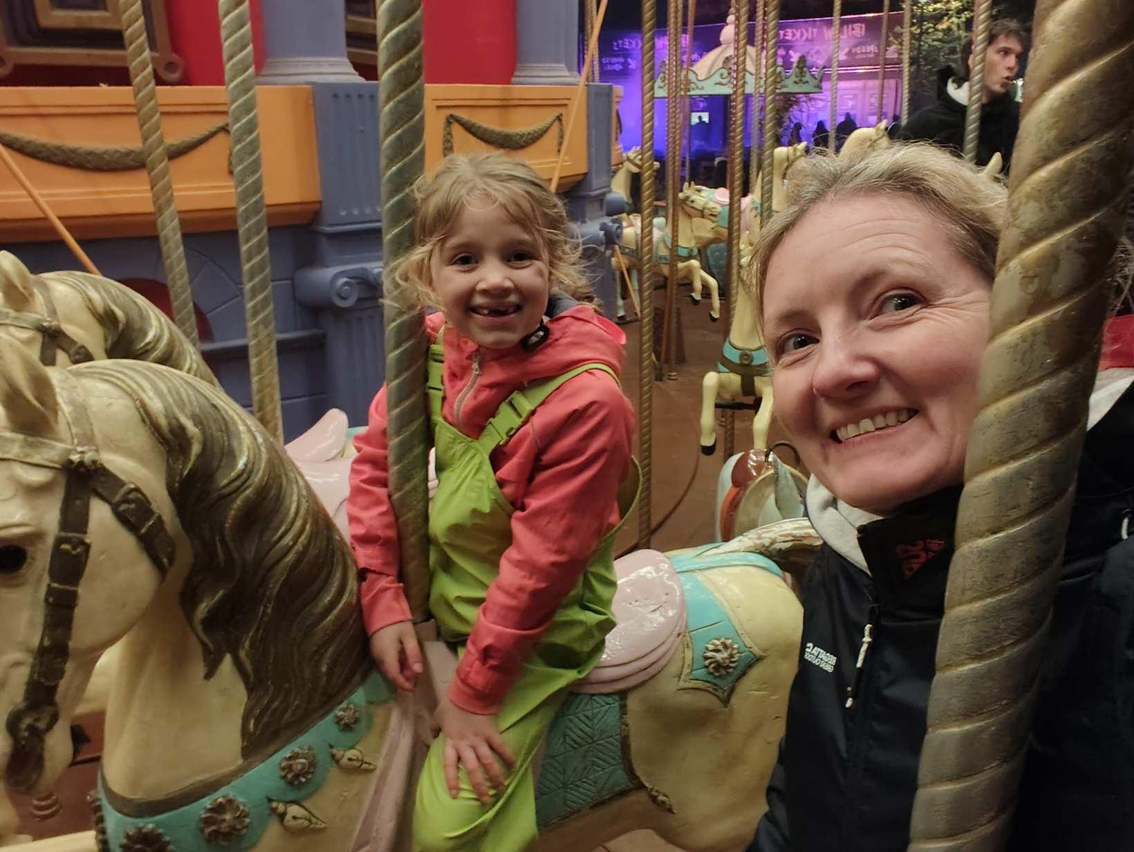 Apparently you can get anti scare badges for kids who don't want to interact with the actors but we couldn't find anyone giving them out. It was hilarious to watch them creep up on groups of unsuspecting teens and scare the life out of them though. Currently this is daylight as well so can only imagine how much spookier this gets after dark. Our next two rides before succumbing to the cries of hunger are waltzer / spinning type rides then Liliya, who is mega brave and we haven't found a ride she won't go on yet, wanted to do the little pony ride. Robert is technically too tall for this but the operator doesn't seem bothered so even he can't resist a gentle ride around the course.