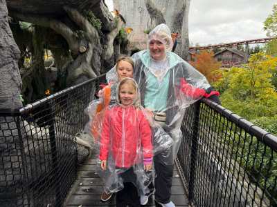 There's a good mixture of rides to keep everyone entertained but our favourite is the wooden coaster called Heidi which we end up going on three times over the course of the day. The most pointless ride we all agreed was the haunted house, a witch asked our group if someone would give her 7 years for safe passage which did not agree to but then other than a lady dressed as a ghost walking past us and a zombie sitting in a chair that was it until we got to the end when we had to say a spell based on the TV show and the failed theatre show we bailed on then the same 3 characters started muttering something on the TV screen. We did the dragon coaster (also related to this TV show) and the log flume, I had come prepared with ponchos for us all as I know how wet you can get on the water rides and drying off in this weather would be impossible. Yes we looked like absolute fools and Al wouldn't join in but we survived as dry as we went on.