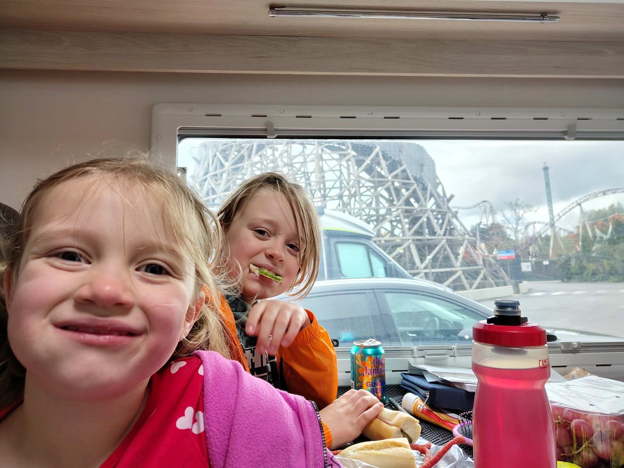 It's certainly up there in my favourite rides along with Robert's too. The second time I went with him he sounded like a pro knowing which side I should sit on for a more extreme version and he wasn't wrong it was really intense. With one of the big coasters under our belt we headed back to the van to get lunch and warm up. We joked with Robert about having a nap and he said he could really do with one. At this point the heavens opened again and we figured a cheeky 30 mins might them some good after a late night yesterday. Liliya was insistent that she didn't need a nap so I snuggled up with her and caught myself a few winks too.
