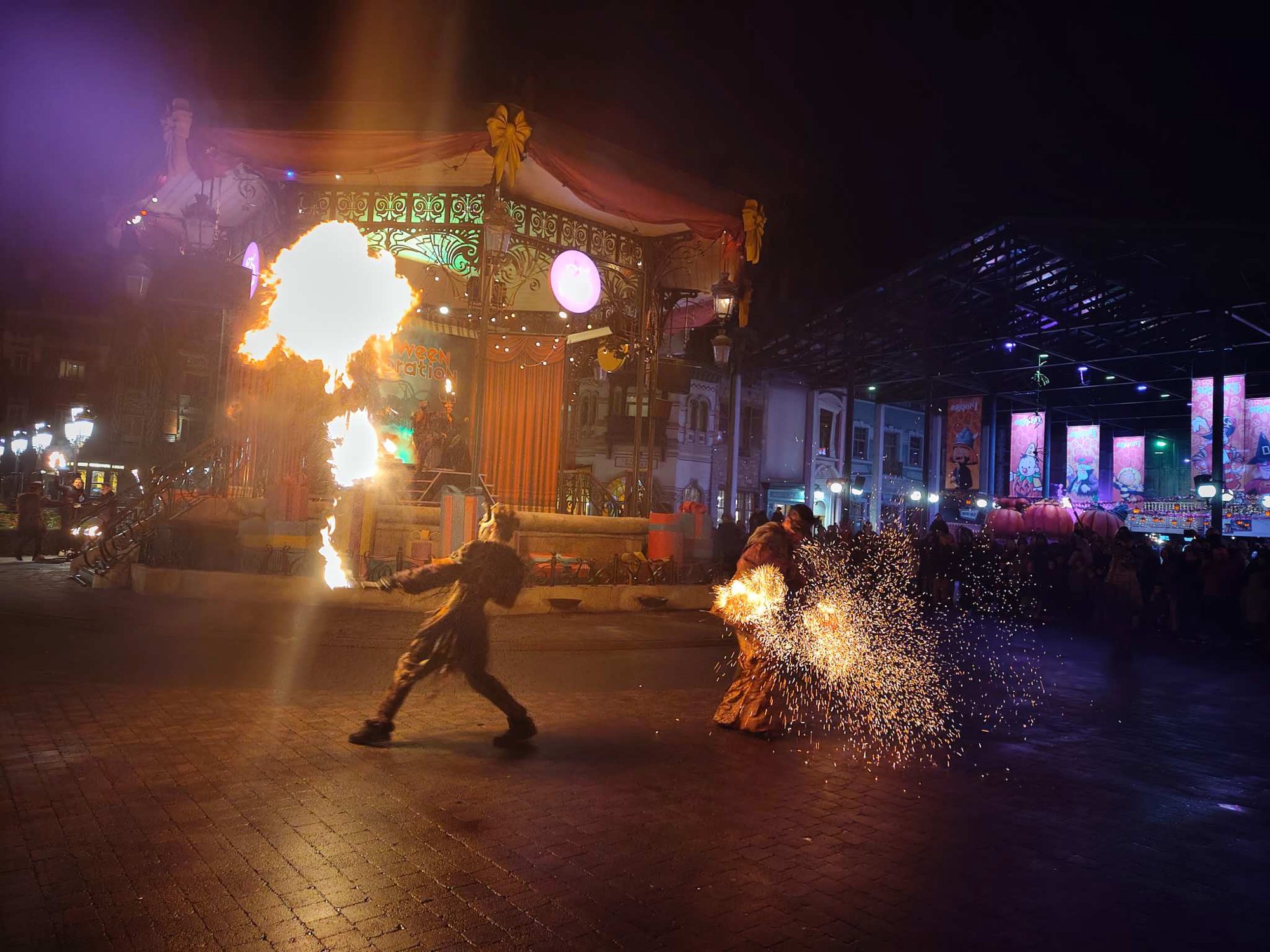 Today they have late hours in the park with special Halloween shows and fireworks meaning we've got 12hrs to fit everything in. First we're treated to a mini Halloween show at the entrance then our first ride in their version of something resembling it's a small world / snow white style ride with these little elf people and it's actually our longest queue of the day.